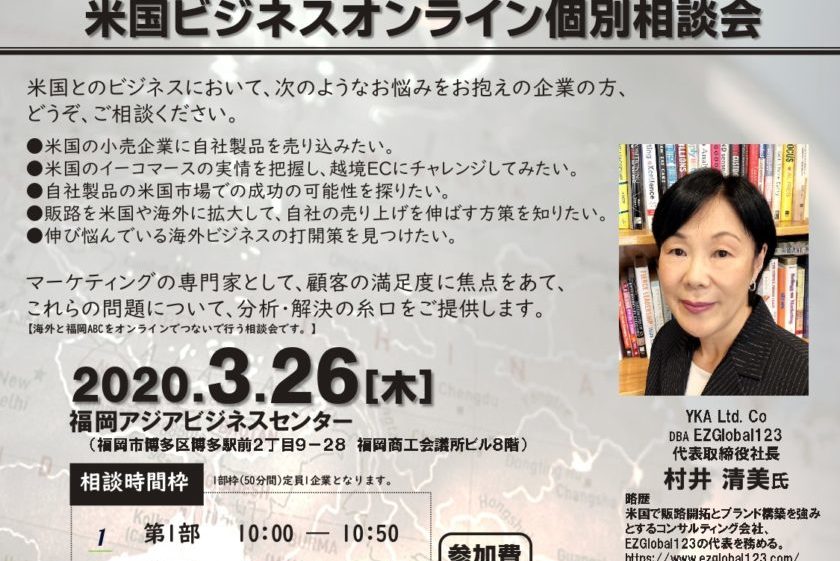3月26日(木) に福岡アジアビジネスセンター主催による、米国向けマーケティング オンライン個別相談会が開催されます。弊社の代表を務める 村井清美が、海外市場での新製品成功、販路拡大、競合との差別化、伸び悩んでいる製品の打開策など、顧客の満足度に焦点をあて、マーケティングの手法を用いて、その解決のお手伝いとなるアドバイスを致します。